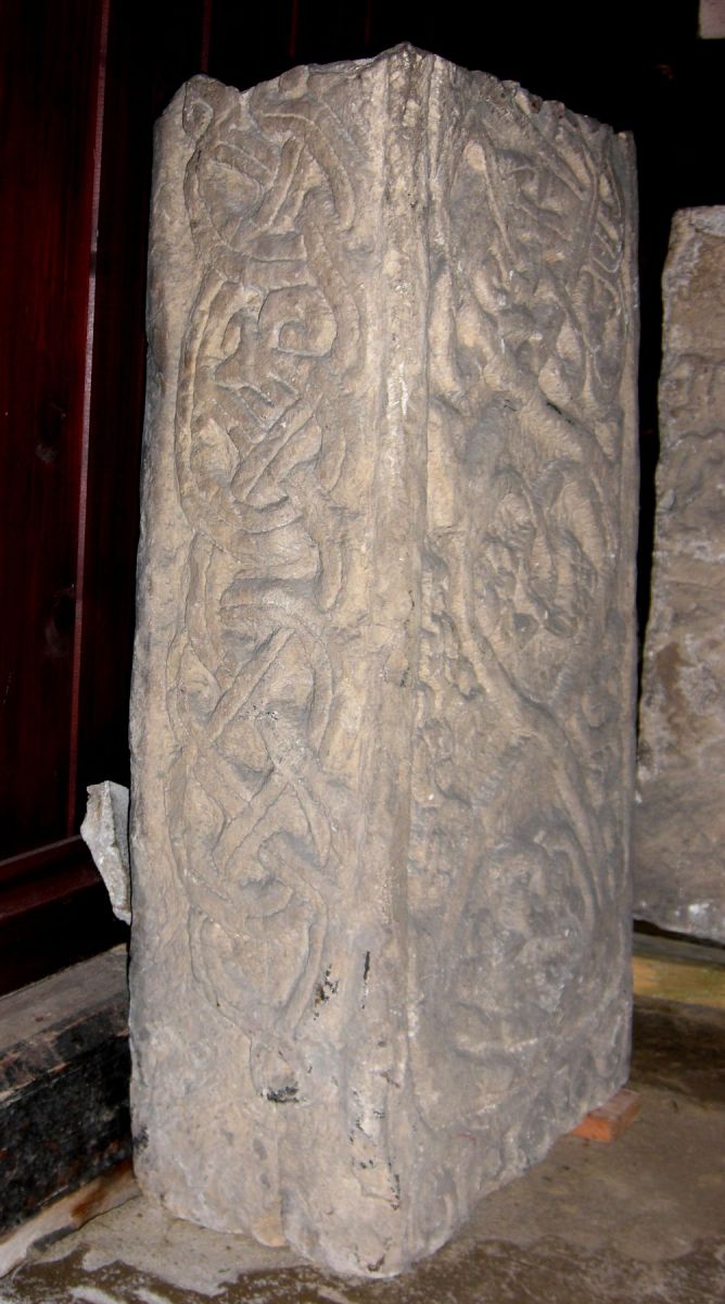 There are two stones which were found some years ago and were removed from the walls of the Church. They are parts of different monuments and the smaller one is the older. They are assigned by the late Professor Collingwood to the tenth and eleventh centuries and are fully discussed by him in the Yorkshire Archaeological Journal, vol. xxiii. | |||